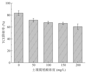 腐殖酸作为土壤有机质的主要成分,在自然界中广泛存在。为探究有机质对土壤TCE降解的影响,设置了0、50、100、150、200 mg/L腐殖酸浓度,以评估其对体系内降解反应的影响。结果如图 10所示,TCE的降解率与腐殖酸的含量呈负相关,随着土壤中腐殖酸含量的增加,TCE的降解率逐渐下降。具体而言,在对照组未投加腐殖酸时,TCE在4 h内的降解率为83.32%;而当腐殖酸含量达到200 mg/L时,TCE的降解率降至60.57%。这一现象表明,较高浓度腐殖酸显著抑制了S-nZVI/PS体系中TCE的降解。这种抑制作用可能归因于:①腐殖酸作为一种大分子有机物,含有丰富的芳香结构和多种还原性官能团(如羧基与羟基)[23],能够直接与体系中SO4•–以及其他自由基反应,导致自由基被淬灭;②过量的腐殖酸可能在S-nZVI表面吸附,形成有机包裹层,从而屏蔽活性位点,抑制电子转移;③腐殖质与溶解的Fe2+形成稳定的络合物,可能会抑制Fe2+对PS的活化,从而降低了氧化降解过程的整体效果。有研究[24]认为,高浓度腐殖酸主要通过自由基消化和表面钝化抑制PS氧化降解污染物,但土壤中低浓度的腐殖酸可能通过促进Fe2+释放和电子转移而增强S-nZVI活化PS降解污染物。此外,相对分子量小、芳香化程度低的腐殖酸(如富里酸),则可能更容易参与电子传递,从而影响PS的氧化降解效果;而在酸性条件下,腐殖酸与S-nZVI的络合作用更显著,这可能促进Fe2+的释放,从而促进PS氧化降解污染物。这些方面有待进一步的研究。