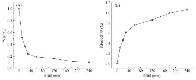 图 12 反应体系内PS浓度(A)、总Fe浸出率(B)随时间变化 Fig. 12 Changes of PS concentration (A) and total iron leaching rate (B) with time in reaction system |