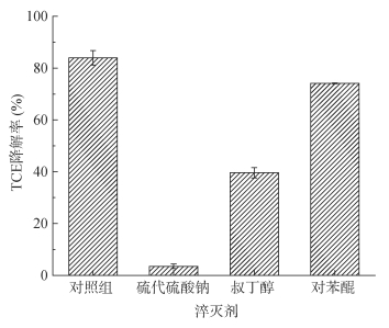 为确定反应体系中的主导活性自由基,使用硫代硫酸钠、叔丁醇、对苯醌分别作为SO4•–、·OH和O2•–的淬灭剂,进行化学探针试验,确定体系内主导自由基。如图 13所示,硫代硫酸钠的添加导致降解率降低至3.48%,而硫代硫酸钠主要淬灭SO4•–,该结果揭示了体系中对TCE的降解起核心主导作用的自由基是SO4•–。在添加叔丁醇的体系中,TCE的降解率为39.61% 左右,这说明·OH参与了体系中TCE的降解,但并非最主要的活性自由基。而添加对苯醌对TCE降解的抑制作用最小,这表明O2• – 对于TCE降解的贡献作用最小。