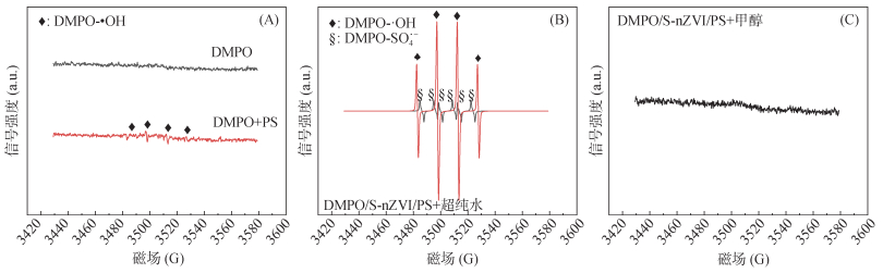 图 14 S-nZVI/PS体系内纯净DMPO(A)、SO4•–和·OH(B)及O2•–(C)的EPR图谱 Fig. 14 EPR maps of pure DMPO (A), SO4•– and ·OH (B), O2•– (C) in S-nZVI/PS system |
