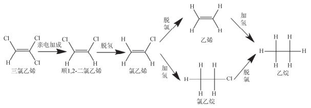 为探究TCE的降解路径,采用吹扫捕集-气质联用仪对降解产物进行鉴定,并结合前人研究进行推导[26],结果如图 15所示。通过标准图谱检索,检测到TCE降解的中间产物为顺1, 2-二氯乙烯、氯乙烯、氯乙烷、乙烷。从GC-MS的测定结果中可以推测,TCE的去除路径可能是SO4•–先攻击三氯乙烯分子中的C=C双键,生成自由基中间体(C2HCl3•–),随后Cl–解离,形成顺1, 2-二氯乙烯,然后SO4•–继续攻击C-Cl键,生成乙烯基自由基(C2H2Cl•–),随后脱去第二个Cl–,形成氯乙烯。氯乙烯的降解分为两条路径,一部分是SO4•–攻击C-Cl键,生成乙烯基自由基(C2H3•–),然后与H·自由基结合完成脱氯生成乙烯,最后通过加氢反应生成乙烷;另一部分是H·自由基攻击双键,取代后成为氯乙烷,在SO4•–的攻击下完成进一步脱氯生成乙烷。