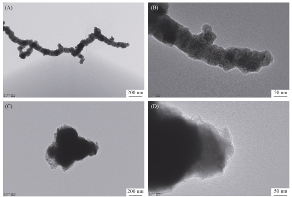 图 2 nZVI(A、B)和S-nZVI(C、D)的TEM图 Fig. 2 TEM images of nZVI (A, B) and S-nZVI (C, D) |