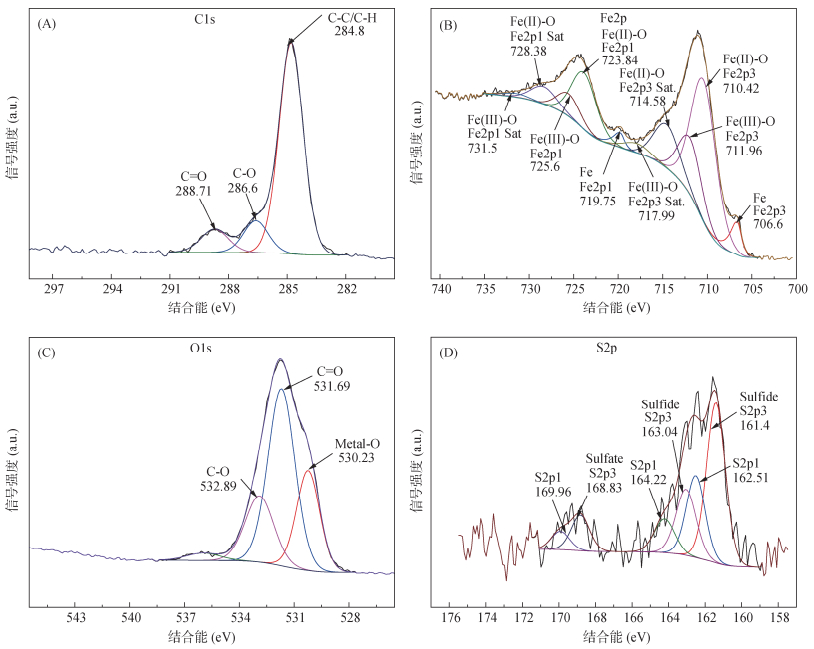 图 5 S-nZVI中C1s(A)、Fe2p(B)、O1s(C)、S2p(D)的XPS图 Fig. 5 XPS of C1s (A), Fe2p (B), O1s (C), S2p (D) in S-nZVI |
