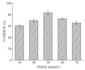 在S-nZVI/PS体系内,PS浓度对于土壤中TCE的降解效果具有显著影响。如图 6所示,在S-nZVI投加量为10 mg/g时,PS浓度从30 mmol/L升至70 mmol/L时,TCE的降解率先增高再降低。当PS浓度为50 mmol/L时,TCE的降解率达到最大值,可达85% 以上。在PS浓度为30~50 mmol/L,随着PS浓度的增高,体系内会增加更多的SO42–,与S-nZVI反应生成更多的SO4•–,促进TCE的降解。且有研究表明,体系内SO4•–浓度的提高会克服其他有机材料与无机离子的竞争,激发更多的SO4•–与PS反应,提高降解效率[20]。而当PS浓度大于50 mmol/L时,过量的PS导致Fe3+和SO42–的产生,反而会降低SO4•–的生成[15],从而降低了S-nZVI/PS体系的降解能力,造成了TCE降解效率的降低。因此,在后续批试验中选择PS浓度为50 mmol/L。