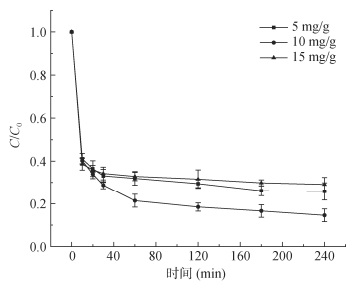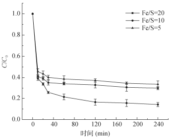 1.3 S-nZVI的制备S-nZVI的制备参考前人研究[15],采用“一步法”液相还原制备。具体步骤如下:将一定质量的FeSO4·7H2O加入到含有100 mL厌氧水的三口烧瓶中,并通入氮气1 h以排除溶液中的氧气;然后通过蠕动泵将连二亚硫酸钠和硼氢化钠的混合溶液逐滴加入到三口烧瓶中,整个反应过程持续使用机械搅拌装置搅拌,确保反应充分进行;滴加结束后,继续通氮气反应1 h,以保证反应完全;随后,利用磁铁沉降法分离材料,倒去上清液,再使用无水乙醇和去离子水清洗3次,随后将其放入冰箱过夜冷冻,放置于真空干燥机进行干燥,得到S-nZVI并抽真空保存。在上述操作的基础上,通过改变连二亚硫酸钠的用量分别制备不同Fe/S摩尔比(5、10、20)的材料。另外,基于S-nZVI的制备步骤,在不添加连二亚硫酸钠的情况下,按照类似步骤制备nZVI。