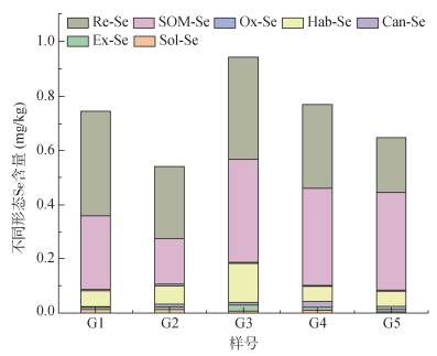 为进一步揭示研究区土壤Se的天然储备优势,通过分析土壤Se的形态来评价其品质和评估富Se农产品的潜力。结果表明,研究区土壤Se的7种形态表现出残渣态(Re-Se)>强有机结合态(SOM-Se)>腐殖质结合态(Hab-Se)>水溶态(Sol- Se)=离子交换态(Ex-Se)>碳酸盐结合态(Can-Se)>铁锰氧化物结合态(Ox-Se)的特征(图 2)。水溶态Se是最易被作物转化的Se,李永华[31]将水溶态Se划分为缺乏、边缘、中等、高Se和Se中毒5个等级,对应含量分别为<0.003、0.003~0.006、0.006~0.008、0.008~0.020和≥0.020 mg/kg。研究区水溶态Se平均值为0.011 mg/kg,属高Se范围。离子交换态也是有效Se的重要形态,碳酸盐结合态是有效Se的潜在可利用形态。以水溶态、离子交换态和碳酸盐结合态作为有效Se的评价指标,研究区有效Se平均值为0.032 mg/kg,占总Se的4.23%。浸取性Se平均值为0.023 mg/kg,占总Se的3.04%。对比说明碳酸盐结合态Se部分参与了浸取。因此,可通过活化碳酸盐结合态Se来增加有效Se量,以达到提高Se生物利用率的效果。