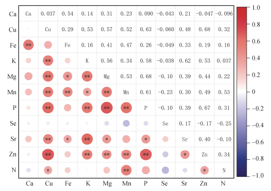 (*、**分别表示相关性达P<0.05和P<0.01显著水平) 图 3 研究区小米营养元素相关关系 Fig. 3 Correlation diagram of nutrient elements in millet in study area |