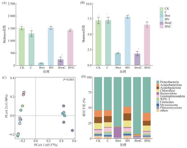 培养第6天,不同处理对细菌群落多样性的影响差异显著(图 1A、1B)。相较于对照CK,C处理细菌丰富度Richness指数降低14.41%,但香农指数(Shannon)上升0.82%;Bwt处理Richness和Shannon指数分别骤降93.43% 和72.83%;BN处理Richness略微提升0.99%,Shannon指数提升8.29%;BwtC处理Richness和Shannon指数分别下降83.73% 和73.85%;BNC处理对细菌多样性的负面影响最弱,Richness降低5.91%,Shannon指数下降9.33%。基于Bray-Curtis距离的主坐标分析(PCoA,图 1C)显示,第6天不同处理土壤细菌群落结构存在显著差异(P=0.001)。不同细菌门类的相对丰度存在显著差异(图 1D)。其中,变形菌门(Proteobacteria,43.3%~96.8%)为绝对优势类群;放线菌门(Actinobacteriota,0.4%~21.5%)、酸杆菌门(Acidobacteriota,0.1%~13.3%)、绿弯菌门(Chloroflexi,0.1%~12.1%)、WPS-2(0.0%~4.4%)在细菌群落中的丰度较高,占细菌总ASV的70%;其余门类主要由芽单胞菌门(Gemmatimonadota,0.0%~6.0%)、浮霉菌门(Planctomycetota,0.4%~1.8%)、黏细菌门(Myxococcota,0.1%~2.6%)及拟杆菌门(Bacteroidota,0.9%~22.0%)组成。相较于CK处理,C处理变形菌门丰度接近,酸杆菌门丰度小幅上升,绿弯菌门相对丰度降低;Bwt处理变形菌门增加49.55%,绿弯菌门与酸杆菌门分别降低97.8% 和98.1%;BwtC处理变形菌门丰度增加92.92%;BN处理变形菌门降低10.8%,酸杆菌门增加14.9%,绿弯菌门增加8.2%;BNC处理变形菌门丰度接近对照CK,WPS-2相对丰度提高15.68%,放线菌门达21.5%。
