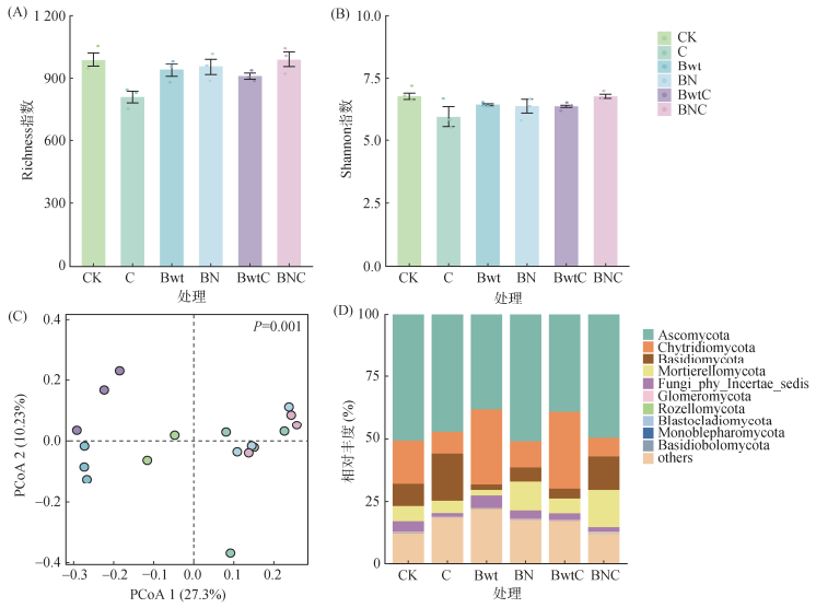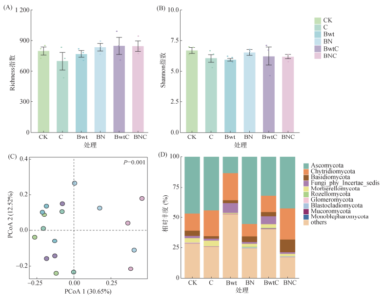 培养第6天,与CK相比,各处理对真菌群落多样性产生差异影响(图 2A、2B)。其中,C处理对真菌群落多样性表现出显著负影响,其Richness指数下降18.25%,Shannon指数下降12.24%;Bwt处理对两者的影响幅度较小,Richness和Shannon指数分别下降5.08% 和4.87%;BN处理Richness指数降幅为3.50%,但Shannon指数降幅为5.72%;BwtC处理Richness和Shannon指数分别下降8.20% 和5.90%;而BNC处理Richness指数略微上升0.20%,Shannon指数维持不变。PCoA结果表明(图 2C),不同处理下真菌群落存在显著差异(P=0.001)。不同真菌门类的相对丰度存在显著差异(图 2D)。其中,子囊菌门(Ascomycota,33.7%~59.4%)为绝对优势类群,壶菌门(Chytridiomycota,2.4%~36.6%)、担子菌门(Basidiomycota,2.5%~43.9%)、被孢霉门(Mortierello-mycota,2.6%~28.3%)及Fungi_phy_Incertae_sedis(1.0%~6.7%)在真菌群落中丰度较高。相较于CK,C处理子囊菌门丰度几乎维持不变,壶菌门丰度下降,担子菌门显著增加,被孢霉门略增;Bwt处理子囊菌门丰度降低,壶菌门丰度上升48.5%,担子菌门锐减75.9%,被孢霉门下降;BwtC处理子囊菌门恢复但仍较CK降低17.2%,壶菌门丰度较CK增加26.0%;BN处理壶菌门丰度下降57.4%,被孢霉门激增149.2%,担子菌门增加16.1%,子囊菌门接近CK;BNC处理子囊菌门丰度提升7.5%,担子菌门增加55.2%,被孢霉门显著提升110.2%。