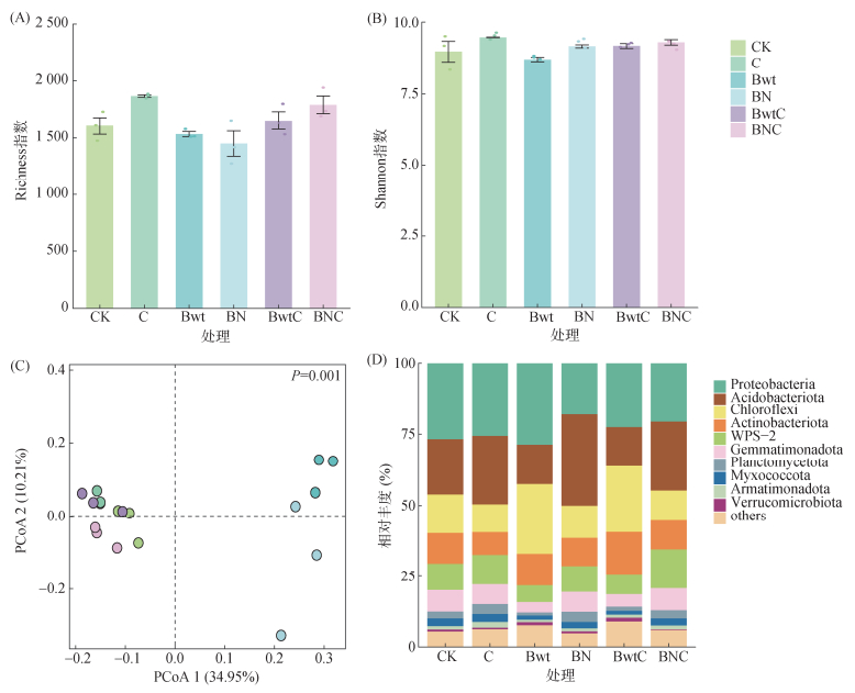 培养第60天,不同处理对细菌群落多样性的影响差异显著(图 3A、3B)。相较于CK,C处理Richness和Shannon指数分别上升16.35% 和5.52%;Bwt处理Richness指数下降4.48%,Shannon指数下降3.03%;BN处理Richness指数降低9.69%,但Shannon指数上升2.04%;BwtC处理Richness和Shannon指数分别上升3.10% 和2.26%;BNC处理Richness和Shannon指数分别提升11.62% 和3.60%。PCoA结果表明(图 3C),不同处理下细菌群落存在显著差异(P=0.001)。细菌门水平相对丰度显示(图 3D),变形菌门(Proteobacteria,17.2%~38.2%)、酸杆菌门(Acidobacteriota,12.7%~37.6%)、绿弯菌门(Chloroflexi,8.8%~25.5%)、放线菌门(Actinobacteriota,7.8%~21.5%)及WPS-2(5.6%~15.7%)为细菌群落主要优势类群;其余门类包括芽单胞菌门(Gemmatimonadota,3.6%~8.2%)、浮霉菌门(Planctomycetota,1.0%~4.8%)、黏细菌门(Myxococcota,1.2%~3.2%)、Armatimonadota (0.8%~2.0%)和疣微菌门(Verrucomicrobiota,0.3%~1.5%)。相较于CK,C处理中酸杆菌门丰度增加25.6%,绿弯菌门下降21.0%,变形菌门下降14.0%,WPS-2上升24.1%;Bwt处理绿弯菌门激增88.5%,变形菌门提升14.8%,酸杆菌门与WPS-2分别下降34.4% 和39.8%;BN处理酸杆菌门激增94.2%,变形菌门下降35.8%,绿弯菌门下降34.2%,WPS-2微降13.5%;BwtC处理绿弯菌门增长81.7%,放线菌门倍增99.4%,变形菌门与酸杆菌门分别下降26.5% 和56.5%;BNC处理WPS-2显著增加67.2%,酸杆菌门增长29.5%,变形菌门与绿弯菌门分别下降21.6% 和33.7%。