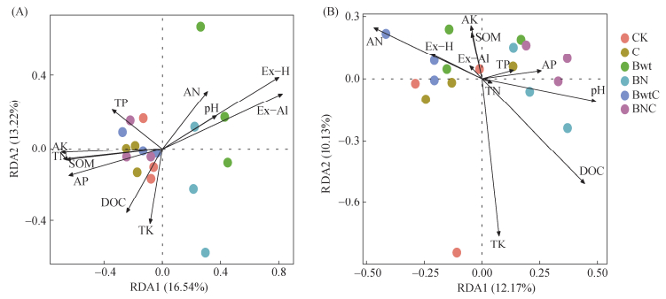 培养第60天时,RDA分析显示前两轴对细菌和真菌群落结构变化的累积解释度分别为29.76% 和22.3%(图 6)。SOM、TN、AK、Ex-H和Ex-Al是影响细菌群落组成结构的主要因素(表 3)。BN处理细菌群落与Ex-H、Ex-Al呈正相关;BNC处理细菌群落与SOM、TN、AK呈正相关,但与Ex-H、Ex-Al呈负相关;二者分布距离较远,群落结构差异显著。DOC和TK是真菌群落组成结构核心驱动因子,BN处理真菌群落与DOC呈正相关,而BNC处理真菌群落与DOC呈负相关。