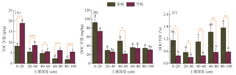 (图中误差线为标准误(n=3),不同小写字母表示同一树种下不同土层间差异显著(P < 0.05),*、**、***分别表示同一土层下不同树种间差异在P < 0.05、P < 0.01、P < 0.001水平显著;下同) 图 1 不同深度林地土壤TOC含量(A)、DOC含量(B)和DOC/TOC比值(C) Fig. 1 TOC (A) and DOC (B) contents, and ratios of DOC/TOC (C) of forest soils in different depths |