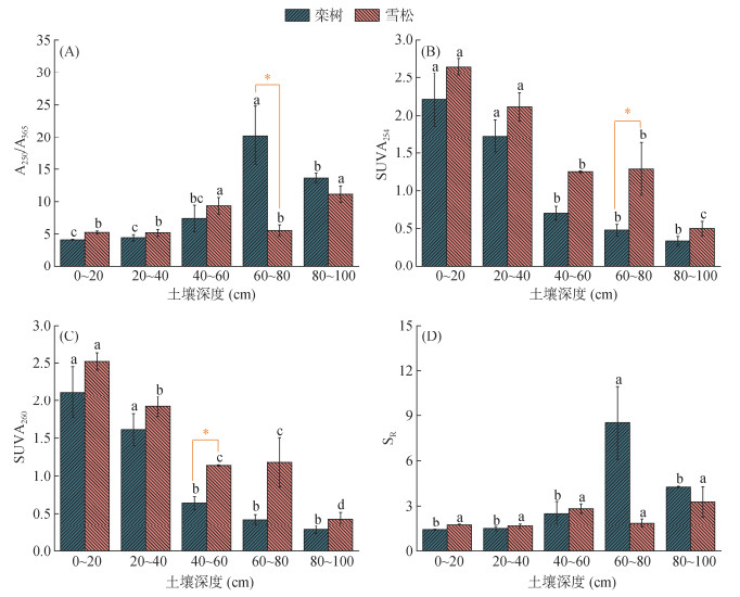 SR可表征DOM的结构特征,如分子量大小、胡敏酸/富里酸比例等。不同深度土壤DOM的SR值介于1.4~8.5(图 2D)。浅层土壤DOM的SR值较低,表明其分子量较大(与分子量成反比)[16]。据此,栾树树下60~80 cm土层DOM的分子量显著性低于其他土层(P < 0.05),其他深度土层DOM的分子量之间没有显著差异。雪松树下不同深度土壤DOM的分子量差异不显著。DOM分子量越小,其向下物理迁移的可能性越大,但同时因其微生物可利用性高,使其可被快速转化,一定程度上阻碍其向下迁移。