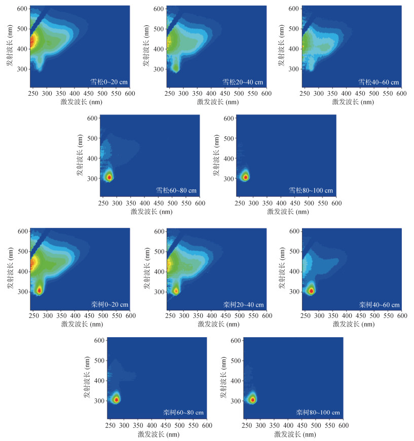 2.3 不同深度林地土壤溶解性有机质荧光光谱特征不同深度林地土壤DOM的荧光光谱特征如图 3所示。不同深度土层DOM的荧光特征差异较大(荧光强度与分布)。随土层深度增加,不同树种林下土壤DOM荧光特征变化趋势一致,即土壤DOM特征组分对应的发射波长(Em)与激发波长(Ex)逐渐降低,表明从表层到深层,土壤DOM分子量、芳香性、分子大小、疏水性等逐渐降低,其组分类型也由占比小的氨基酸类物质转变为主导性占比[17-18]。土壤孔隙可起到筛分DOM分子尺寸的作用。DOM分子尺寸越小,其生物可利用性越高,易被进一步转化为蛋白质类物质,如类色氨酸[19]。对比两种树种的林下土壤,栾树树下表层土壤含有更多的蛋白质类物质。