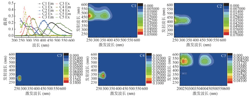 图 4 EEM-PARAFAC特征曲线和荧光特征组分 Fig. 4 Characteristic curves and fluorescence components obtained by EEM-PARAFAC analysis |