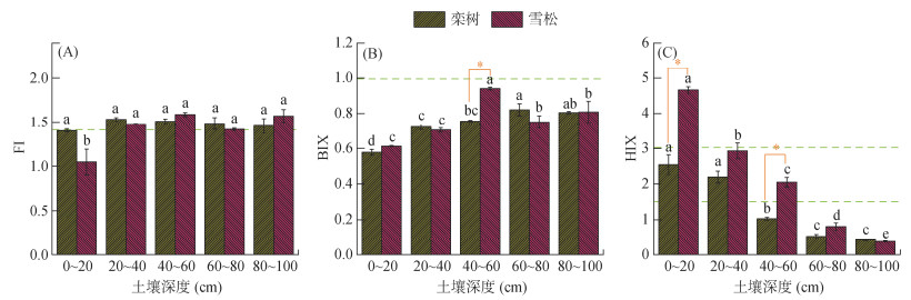 (图中不同小写字母表示同一树种下不同土层间差异显著(P < 0.05),*表示同一土层不同树种间差异显著(P < 0.05)) 图 6 不同深度林地土壤DOM荧光指数(A)、自生源指数(B)和腐殖化指数(C) Fig. 6 Fluorescence (A), biological (B), and the humification (C) indexes in forest soil DOMs in different depths |