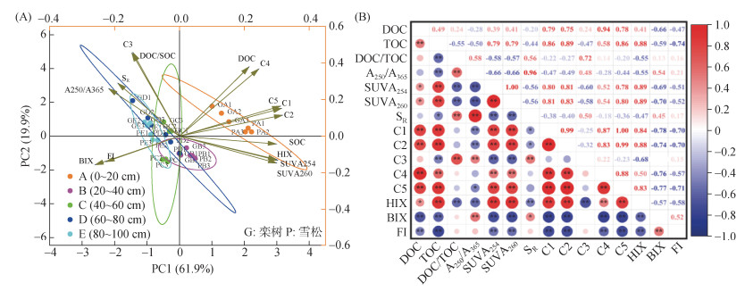 (*、**分别表示在P < 0.05、P < 0.01水平显著相关) 图 7 不同深度林地土壤DOM含量、组分与性质主成分分析(A)和相关性分析(B) Fig. 7 Principal component analysis (A) and Pearson correlation analysis (B) on characteristics of soil DOMs in different depths |