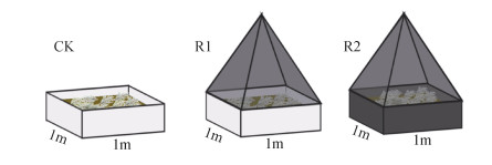 1.2 样地布置样地布置时间为2018年7月20日,在天然阔叶林(浙江天竺桂)和人工针叶林(杉木)中分别设置9个样方(3种处理,每个处理3个重复),每个样方由PVC板围成,大小为1 m × 1 m。对照(CK)不采取任何隔离凋落物措施;R1为去除新鲜凋落叶,用60目尼龙网将地上凋落物与样地土壤隔离,确保没有凋落叶进入样方内,每年5月份将样方外处于分解后期的凋落叶洒入样方内,且每年选取样方外不同方位的凋落叶,确保没有新鲜凋落叶进入样方内;R2为去除新鲜凋落叶和根系,在R1的基础上将400目尼龙网沿着PVC板打入土中,深度为60 cm,阻止外界根系进入。样地具体布置见图 1。