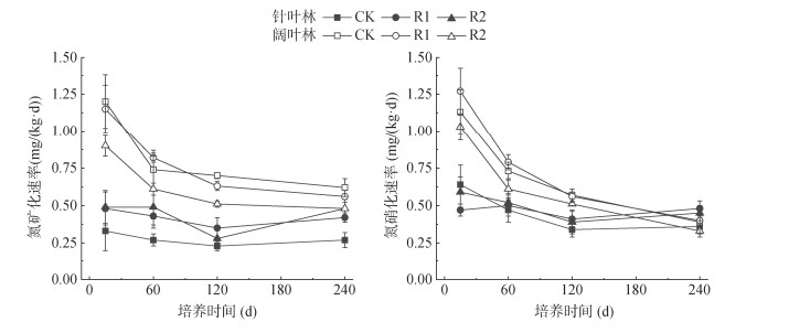 净氮矿化速率与硝化速率因林型而异(图 10)。针叶林两者均呈先降后升趋势,除第60天R2处理矿化速率显著高于CK(80.26%)外,处理间无显著差异;R1和R2处理氮矿化速率总体高于CK,增幅为22.87%~80.26%。阔叶林两者在0~15 d最高,之后持续下降,处理间无显著差异,120~240 d进一步下降45.98%~51.34%(矿化)和65.38%~68.84%(硝化)。