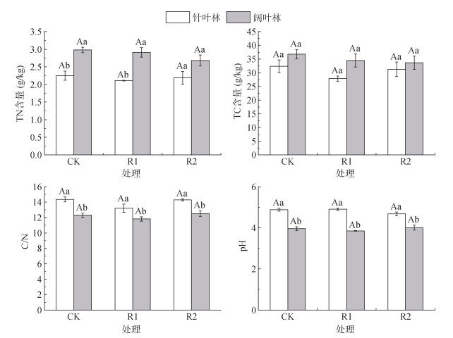 2 结果与分析 2.1 叶和根凋落物处理对针阔叶林碳氮的影响不同凋落物处理对土壤全碳(TC)、全氮(TN)、碳氮比(C/N)及pH均无显著影响,但林型间各项指标差异显著(图 2)。在针叶林中,TC与TN含量均表现为CK > R2 > R1,其中R1处理较CK分别下降13.96% 和6.36%,R2处理降幅分别为3.49% 和2.96%。而在阔叶林中,TC与TN表现为CK > R1 > R2,R1处理较CK降幅分别为6.31% 和2.35%,R2处理降幅为8.55% 和10.06%。林型间比较显示,针叶林CK和R1处理的TN含量分别比阔叶林显著降低24.47% 和27.57%(P < 0.05);阔叶林各处理的C/N均显著低于针叶林,CK、R1、R2处理降幅分别为16.59%、11.87% 和14.10%;其pH也显著低于针叶林,降幅分别为23.04%、27.16% 和16.89%。