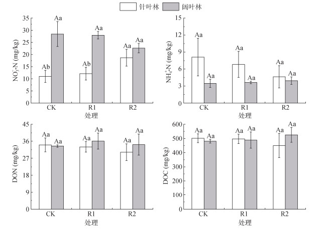 尽管处理间土壤可溶性组分无显著差异,但仍存在一定的变化趋势(图 3)。针叶林中,NH4+-N、可溶性有机氮(DON)和可溶性有机碳(DOC)含量均为CK > R1 > R2,其中R1和R2处理的NH4+-N较CK分别下降15.80% 和42.75%,DON下降3.14% 和11.37%,DOC下降0.83% 和10.30%;相反,NO3–-N在R2和R1处理中分别较CK提高69.63% 和10.08%。阔叶林中NO3–-N表现为CK > R1 > R2,R1和R2较CK分别下降1.75% 和20.46%;而NH4+-N和DOC表现为R2 > R1 > CK,与CK相比,R2和R1处理NH4+-N增幅分别为13.70% 和4.37%,DOC增幅为9.29% 和1.74%;DON则表现为R1 > R2 > CK,在R1和R2中分别较CK提高7.80% 和2.23%。林型间比较显示,阔叶林各处理的NO3–-高于针叶林,CK、R1、R2处理增幅分别为61.29%、56.62% 和17.43%;CK、R1、R2处理下,针叶林NH4+-N含量分别比阔叶林高132.87%、87.87% 和17.26%;DON含量则表现为针叶林CK处理略高于阔叶林(1.84%),而R1和R2处理则分别比阔叶林低8.49% 和11.71%;针叶林DOC含量在CK和R1处理中分别比阔叶林高4.32% 和1.68%,而R2处理则比阔叶林降低14.38%。