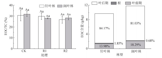易氧化有机碳(EOC)与TC比值(EOC/TC) 在处理间变化较小(图 4)。针叶林中,R1处理的EOC/TC略低于CK (0.74%),R2则比CK降低3.83%;阔叶林中,R1和R2处理分别较CK降低3.99% 和3.65%。针阔叶林中的EOC均主要来源于凋落叶分解后期,其在针叶林和阔叶林中的贡献率分别为84.17% 和81.03%,而凋落叶前期的贡献率分别为13.98% 和18.29%。