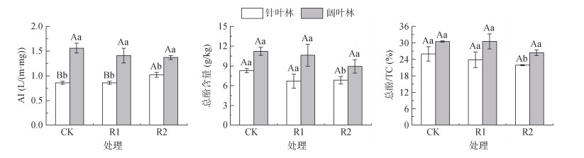 芳香性指数(AI)和总酚含量在处理和林型间表现不同(图 5)。针叶林中,R2处理的AI较CK显著提高19.27%,R1与CK接近;阔叶林中R1和R2的AI分别下降10.00% 和12.56%。针叶林各处理的AI均显著低于阔叶林,CK、R1、R2降幅分别为45.27%、39.22% 和25.38%。总酚含量在针叶林中表现为R1和R2处理分别较CK降低19.28% 和17.45%,阔叶林中R1和R2分别降低5.29% 和20.47%。针叶林总酚含量均低于阔叶林,CK、R1、R2降幅分别为26.17%、37.08% 和23.36%。总酚占TC的比例在针叶林CK、R1、R2处理中分别为25.97%、23.81% 和21.90%,阔叶林中分别为30.49%、30.51% 和26.39%。