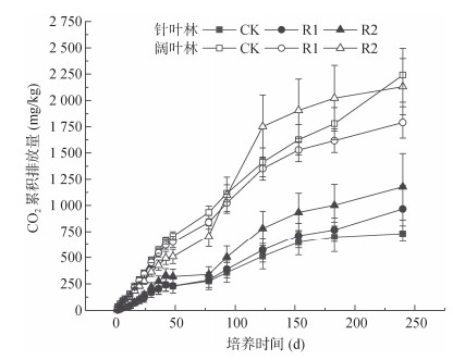 培养期间土壤CO2累积排放量持续上升(图 6)。0~50 d各处理排放量迅速增加,针叶林中表现为R2 > R1 > CK,阔叶林中为CK > R1 > R2;50~75 d增速减缓;75~125 d针叶林所有处理排放量再次显著上升直至培养结束,阔叶林中R2处理排放量超过R1和CK,且在175~240 d CK处理排放重新加快。培养240 d后,针叶林R1和R2处理排放量较CK分别提高32.42% 和46.46%,阔叶林R1和R2处理则分别下降20.08% 和6.11%;阔叶林整体的累积排放量均高于针叶林。