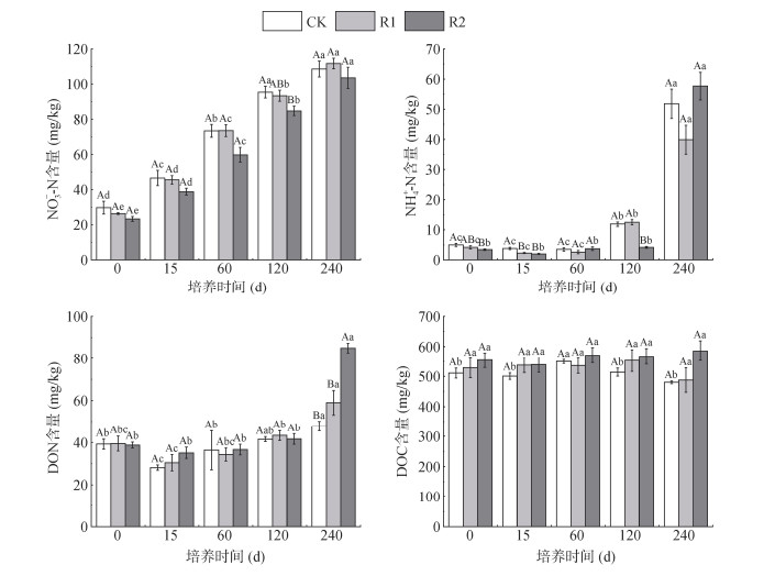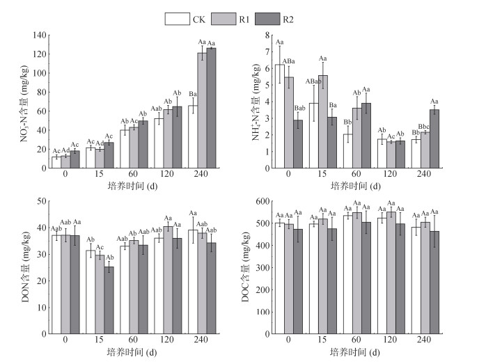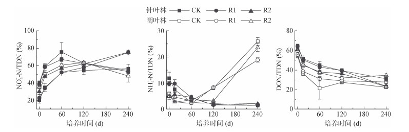可溶性氮组分在培养过程中发生显著动态变化(图 7~图 9)。初始阶段DON占TDN约60%,其后比例逐渐下降。针叶林NO3–-N自第60天起持续上升,至第240天时,R1和R2处理含量显著高于CK,增幅分别为84.24% 和91.99%,NO3–-N占比也达到最高。NH4+-N在第60天时CK和R1较初始显著下降67.22% 和33.75%,第120天时R1继续下降66.14%,R2下降40.57%,其占比持续降低。尽管初始时R2处理NH4+-N含量显著低于CK和R1,但第240天时R1和R2反超CK,分别高出26.09% 和104.43%。DON在第15天降至最低(降幅15.30%~31.75%),后期回升,至第240天时与初始时无显著差异。